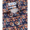 Feel fresh and sharp in this stylish geo print casual shirt. This short-sleeve casual shirt features an intriguing geometric print that combines navy, orange & salmon colourways for a bold and eye-catching look