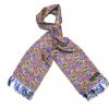 Royal blue, red and yellow paisley silk aviator scarf for a Mod 60’s inspired look Also available in a 5.5 cm width tie and pocket square Measurements: 18 cm x 145 cm 100% Silk Dry Clean Only